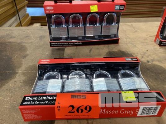 8 x PADLOCKS, LOCKWOOD, ASSA ABLOY, LAMINATED STEEL, (AS NEW)