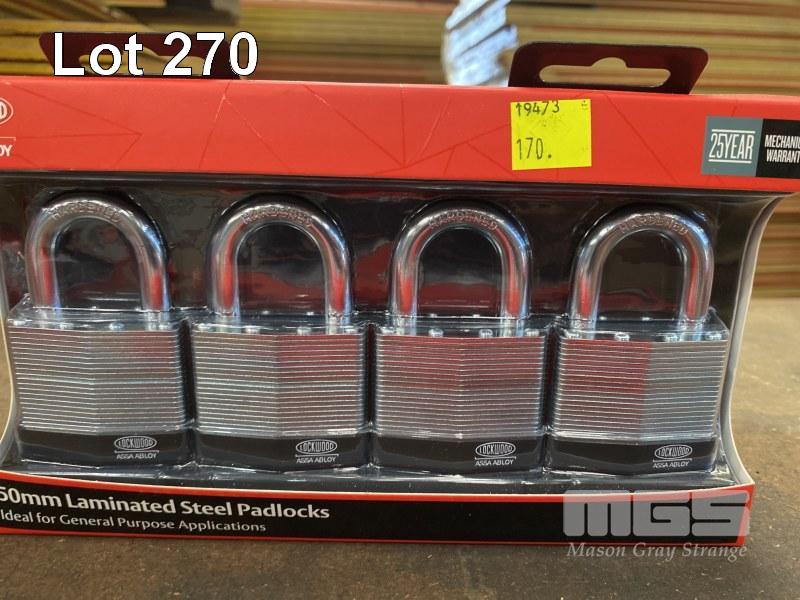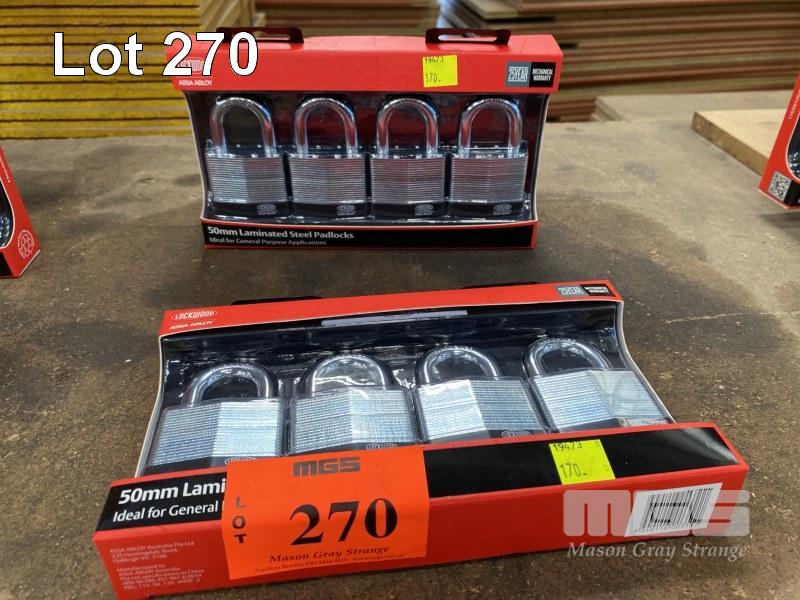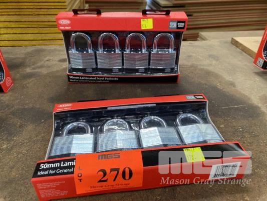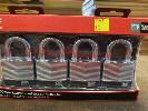 8 x PADLOCKS, LOCKWOOD, ASSA ABLOY, LAMINATED STEEL, (AS NEW)