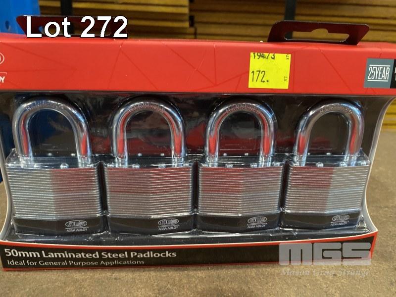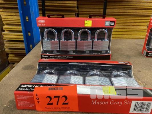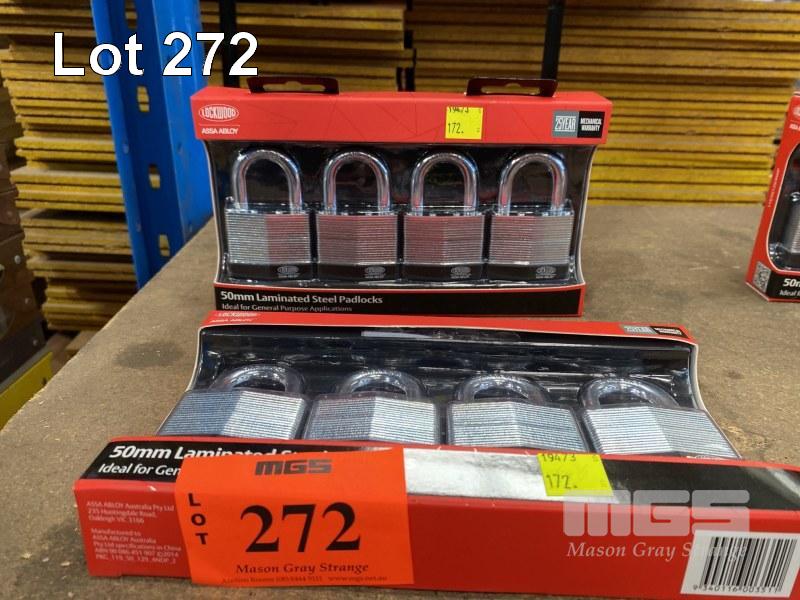 8 x PADLOCKS, LOCKWOOD, ASSA ABLOY, LAMINATED STEEL, (AS NEW)