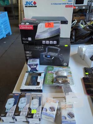 CD BOOM BOX, DVD PLAYER, STEAM IRON & ASSORTED ELECTRICAL