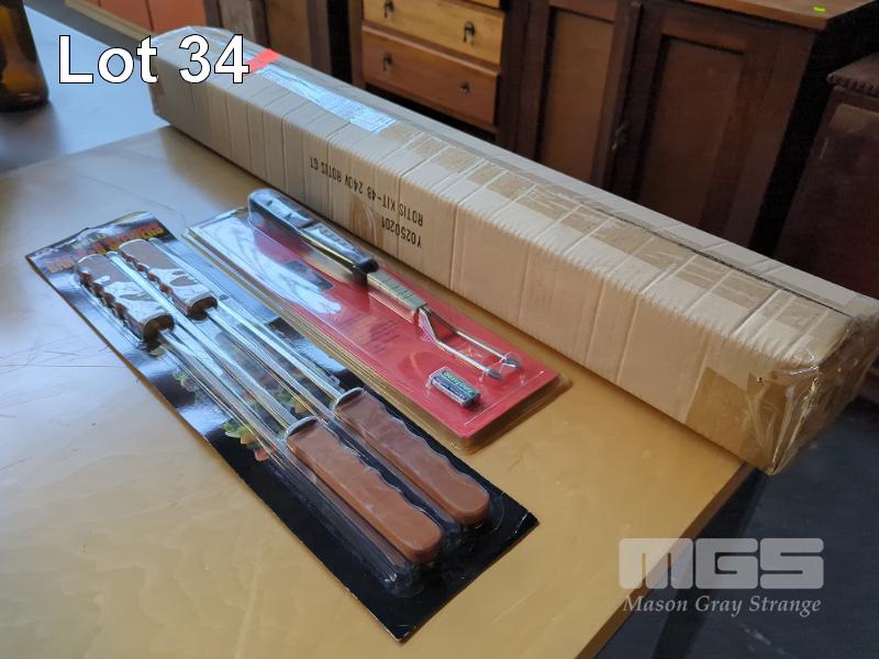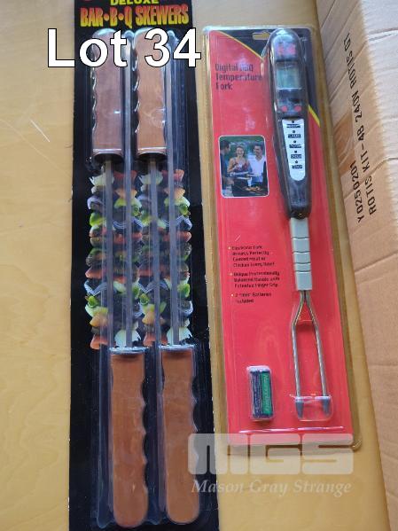 ELECTRIC STAINLESS STEEL ROTISSERIE KIT. 240V A.C. MOTOR. 935 MM SPIT ROD, 2 X SKEWER FORKS, COLLAR, MOUNTING BRACKETS ETC.* SUIT 4-BURNER BBQ * RRP $139. DELUXE SET OF BBQ SKEWERS DIGITAL BBQ TEMPERATURE FORK