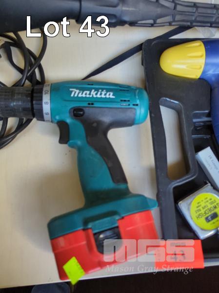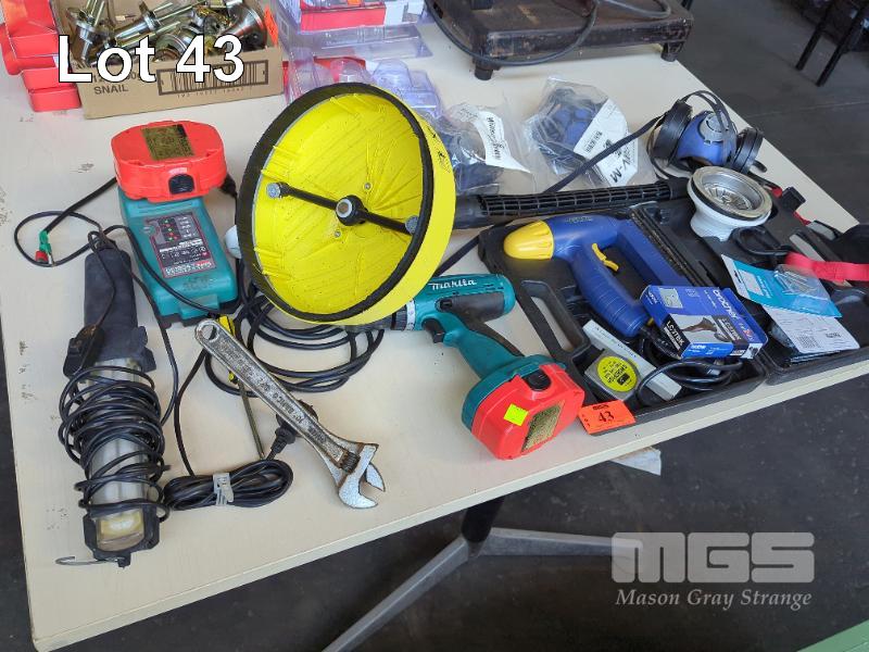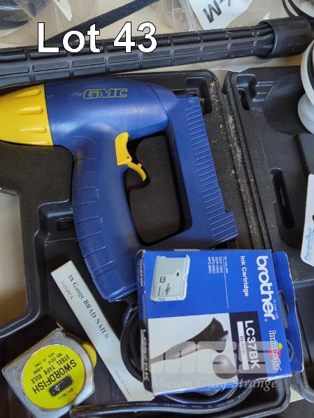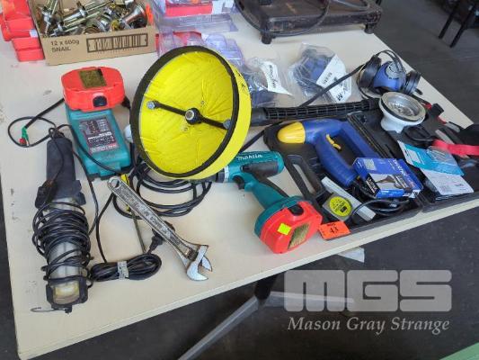 ASSORTED HOME HARDWARE AND POWER TOOLS INCLUDING MAKITA DRILL AND CHARGER, GMC BRAD NAILER, KARCHER SURFACE CLEAER HEAD, WORKSHOP LIGHT, HALF-MASK RESPIRATORS ETC