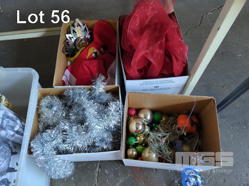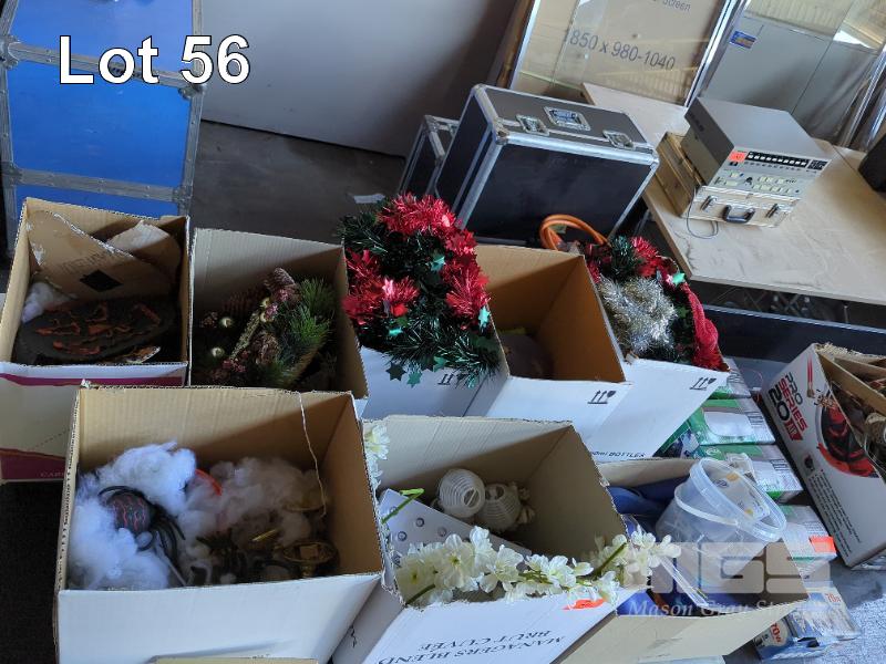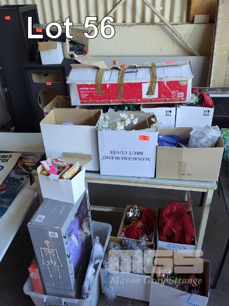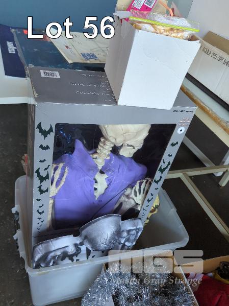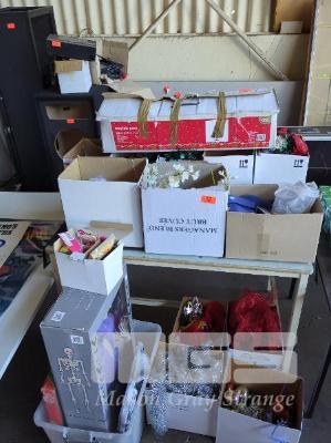 COLLECTION OF DECORATIONS FOR XMAS, HALLOWEEN, AUSTRALIA DAY AND WEDDINGS. INCLUDES XMAS TREE, LED POSE-N-STAY SKELETON AND GLOW IN THE DARK SKULL. 12 X BOXES.