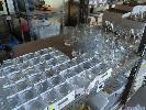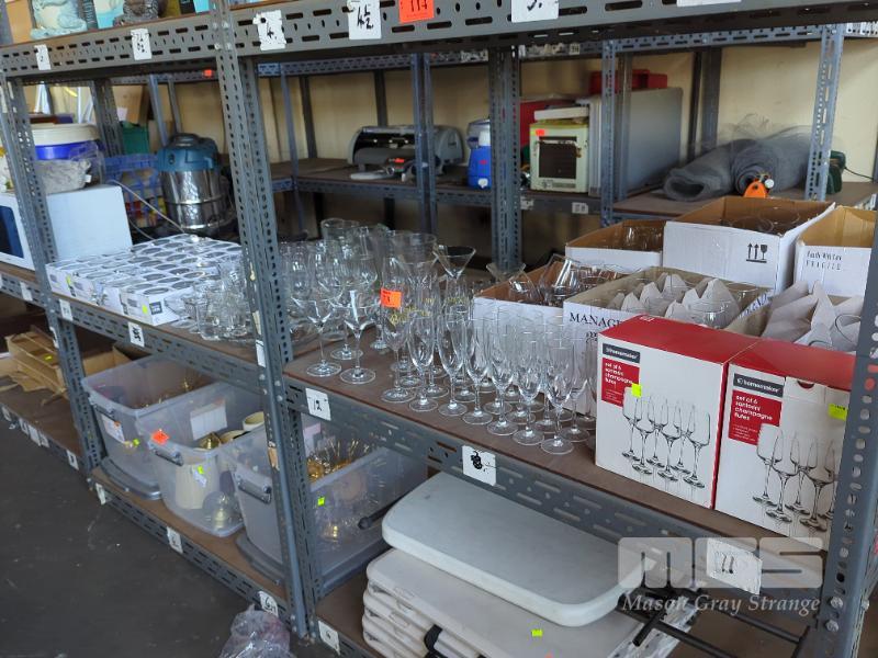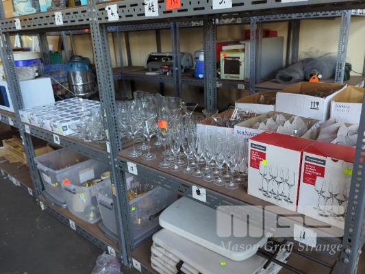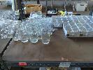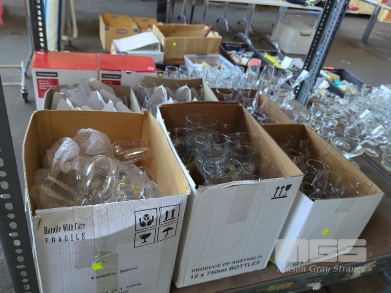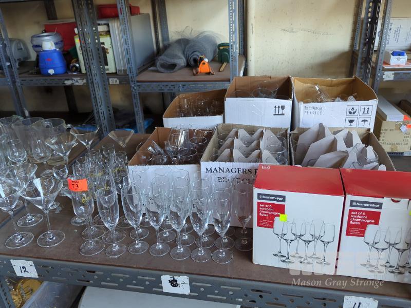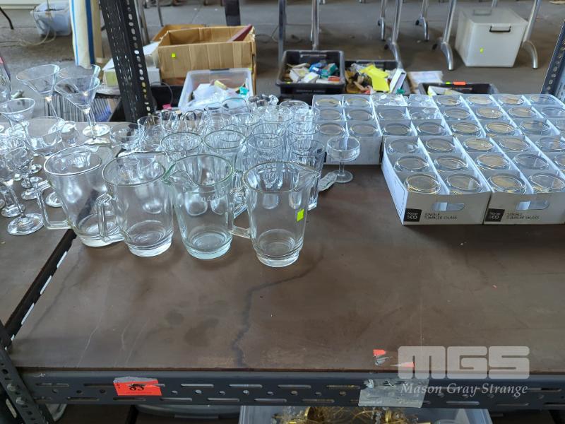 LARGE QUANTITY OF ASSORTED GLASSWARE. INCLUDES TUMBLERS, WINE GLASSES,CHAMPAGNE FLUTES, MARTINI GLASSES, JUGS ETC