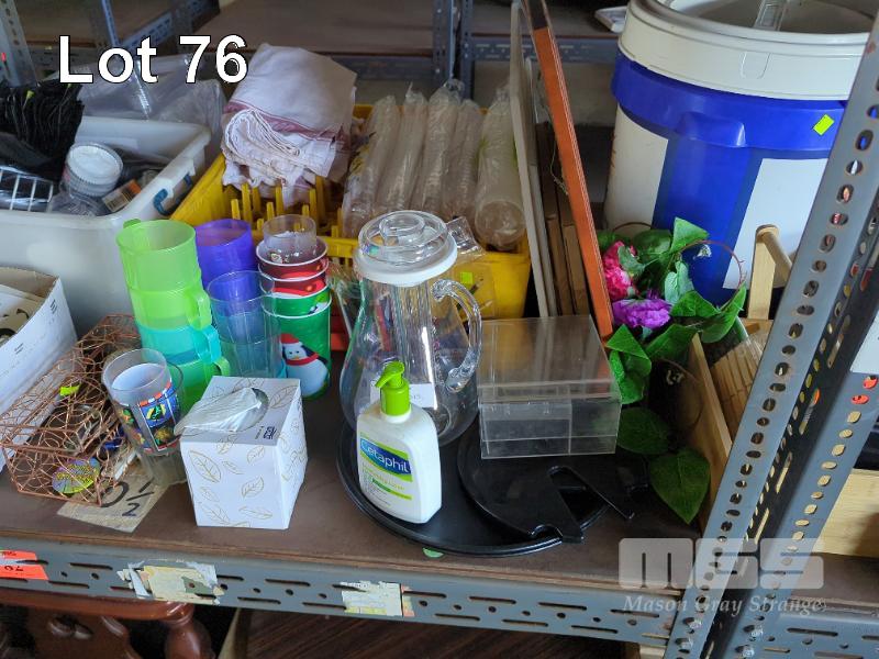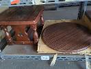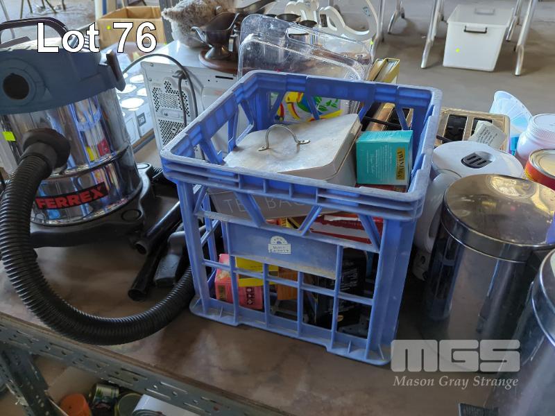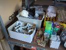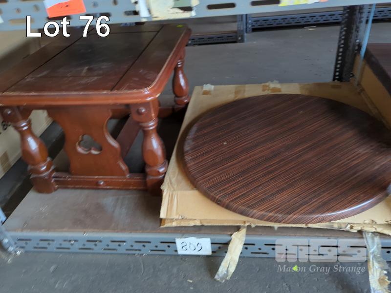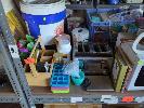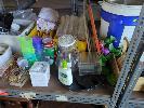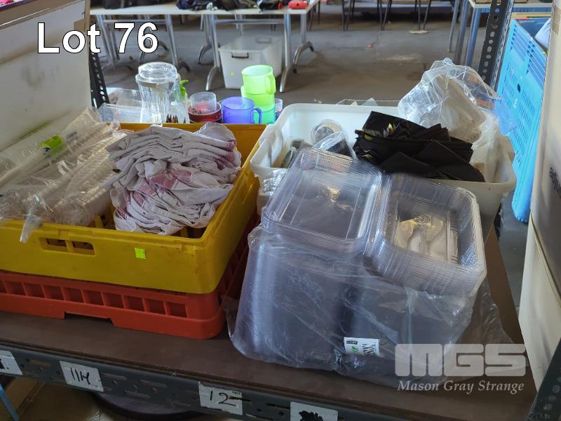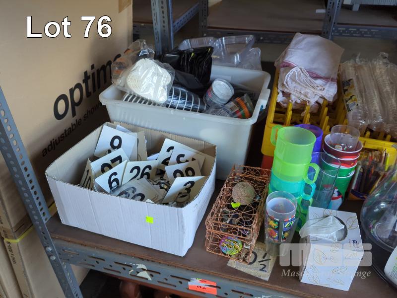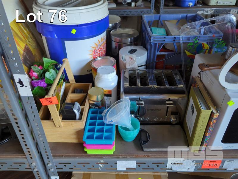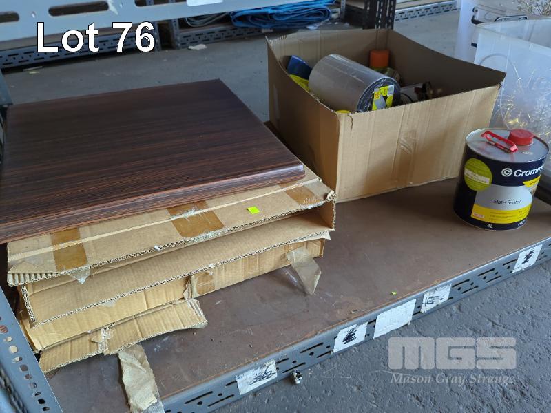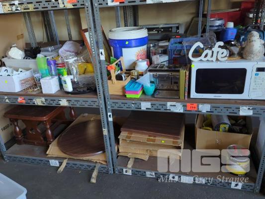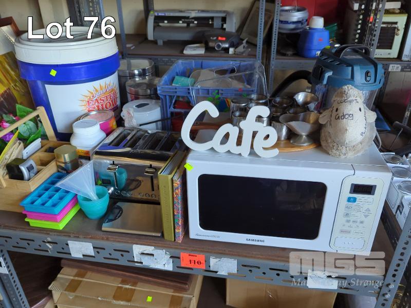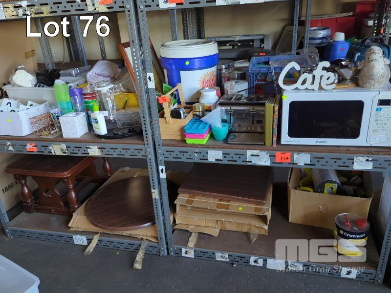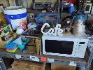 QUANTITY OF CAFE SUPPLIES CAFE TABLE TOPS, MAGAZINE TABLE AND APPLIANCES. INCLUDES TOASTER, MICROWAVE, VACUUM CLEANER, KETTLE, SCALES, TABLE NUMBERS, GLASS JUG, DISPOSABLE CUPS AND MUCH MORE (4 X SHELVES)