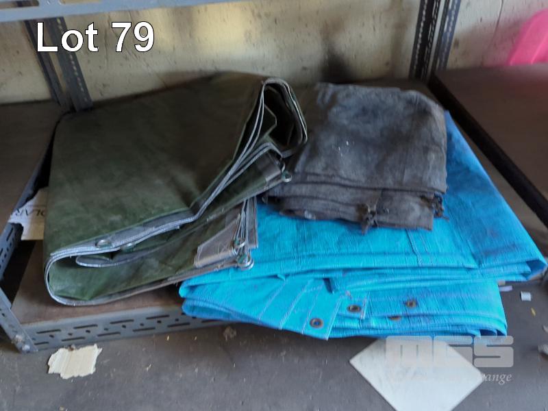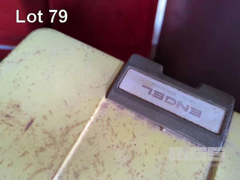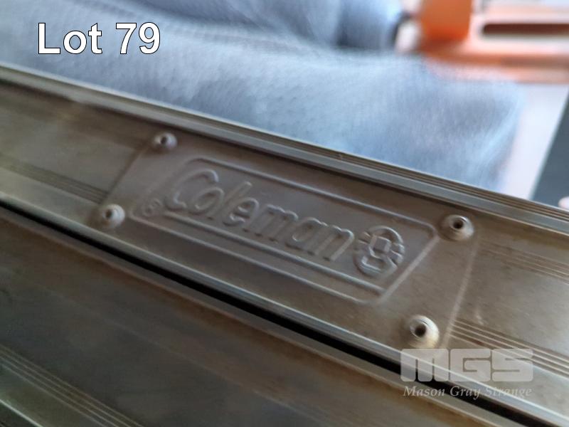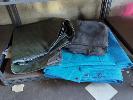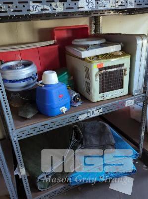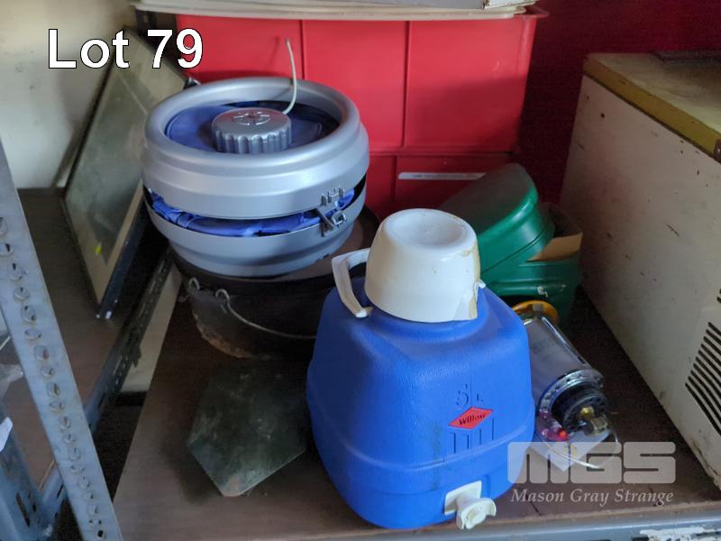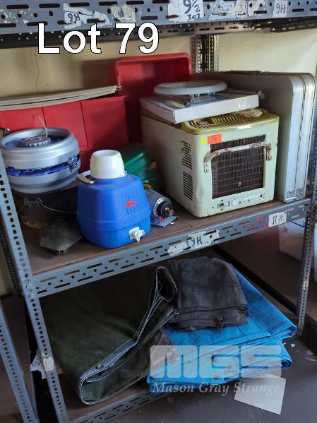 CAMPING GEAR. INCLUDES CLASSIC ENGLE FRIDGE, TUBS, TARPS, COLEMAN FOLDING TABLE ETC (2 X SHELVES)