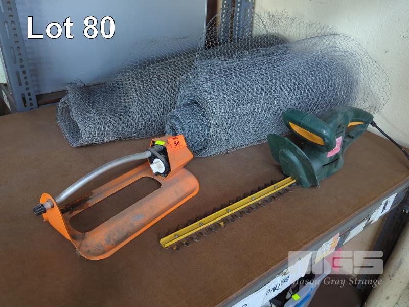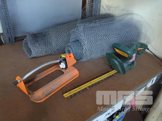 OZITO 240V HEDGE TRIMMER, LAWN SPRINKLER & ROLLS OF CHICKEN WIRE.