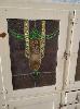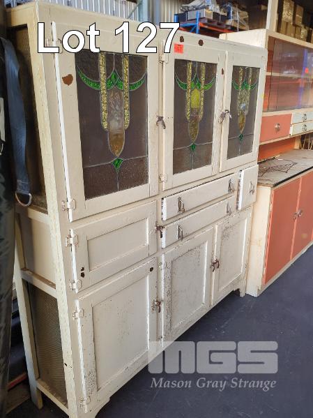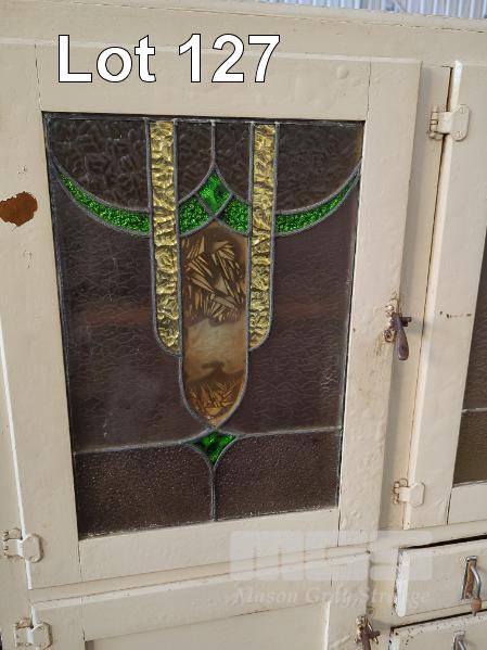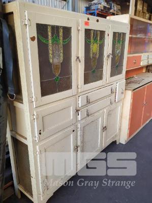 VINTAGE DECO KITCHEN DRESSER WITH STAINED GLASS DOOR PANELS.