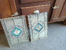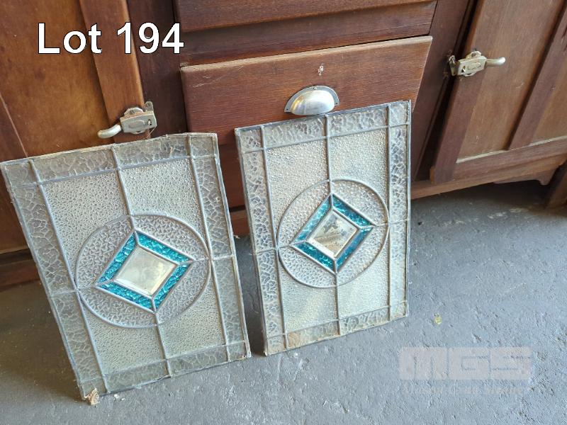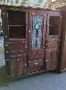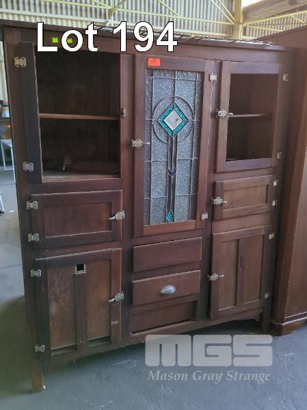VINTAGE DECO KITCHEN DRESSER WITH STAINED GLASS DOOR PANELS.