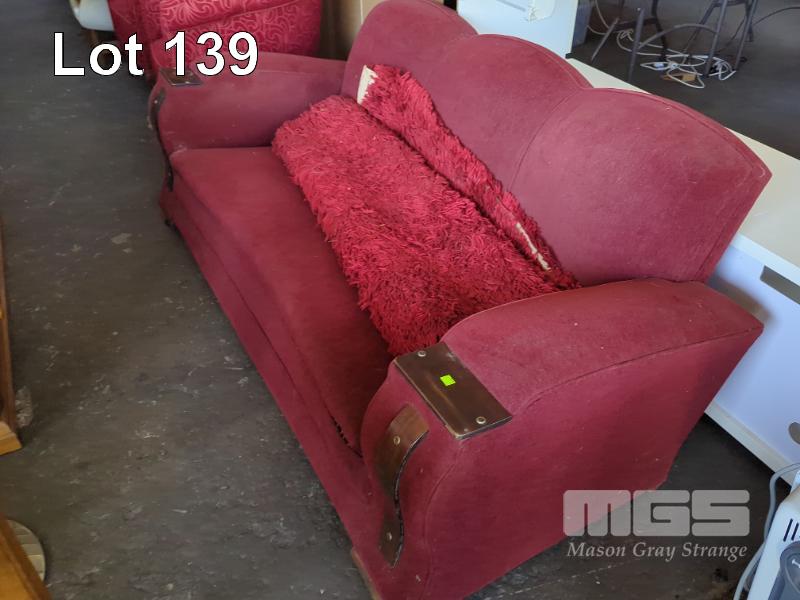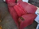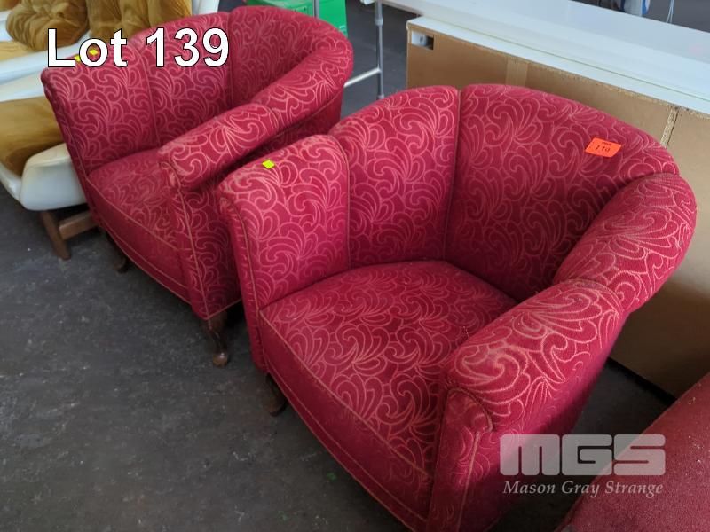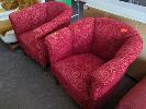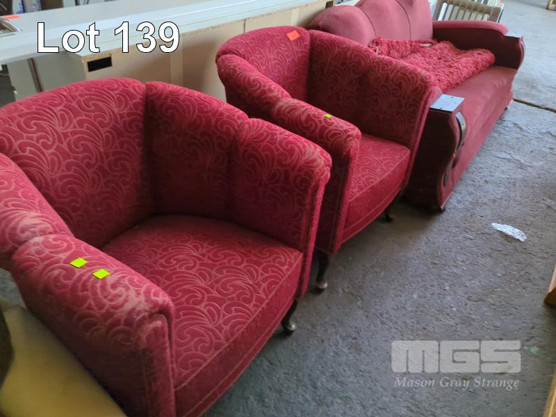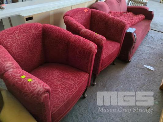 VINATGE 2.5-SEAT FABRIC LOUNGE SUITE, 2 X BUCKET PANEL ARM CHAIRS ALL IN BLUSH BURGUNDY WITH MATCHING FLOOR RUG