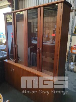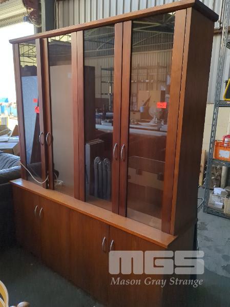 LARGE 2-SECTION ILLUMINATED OAK DISPLAY CABINET, 2 X GLASS SHELVES EACH SECTION. 4-DOOR, SINGLE SHELF UNDER STORAGE.