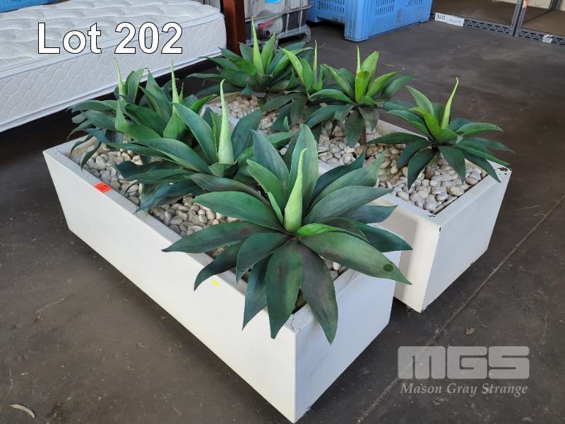 2 X MOBILE PLANTER BOXES WITH ARTIFICIAL SUCCULENTS AND STONE GARDEN.