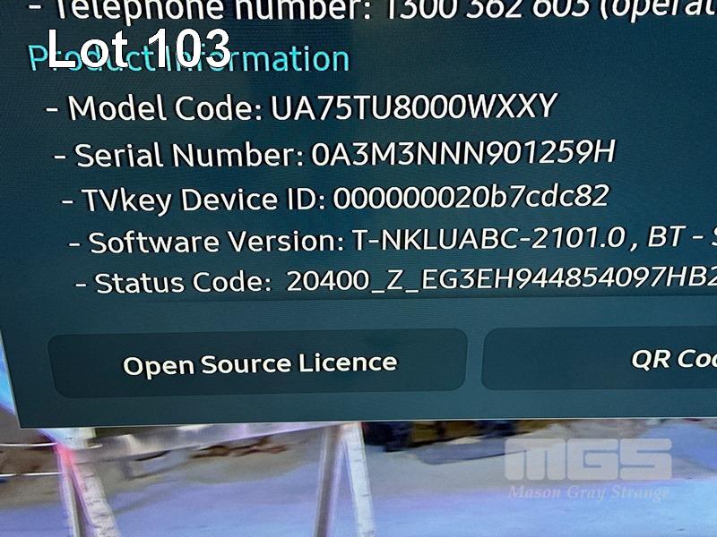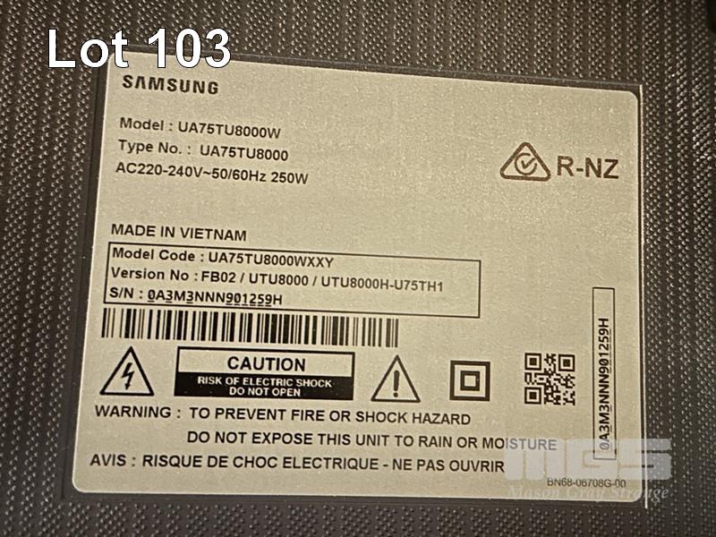 SAMSUNG 75" UHD 4K SMART TV, MODEL UA75TU8000 WITH REMOTE S/N:0A3M3NNN901259H