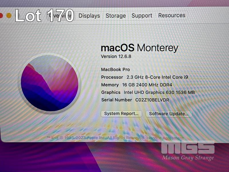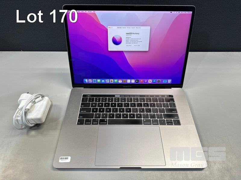 LAPTOP, APPLE MACBOOK PRO (A1990), CORE i9 9880H (9TH GEN) @ 2.3GHz, 16GB DDR4 RAM, 1TB SSD, 15.4" RETINA DISPLAY (2880x1800), INTEL UHD GRAPHICS 630, THUNDERBOLT 3, TOUCHBAR, Wi-Fi, BLUETOOTH, MAC OS 12 INSTALLED & USB-C POWER SUPPLY (NOTE: MINOR MARKS ON SCREEN) S/N:C02Z10BELVDR