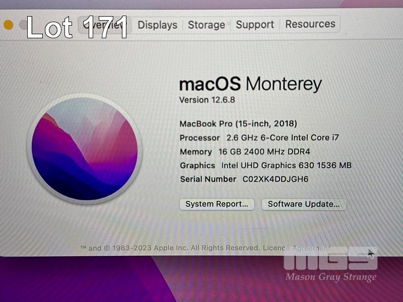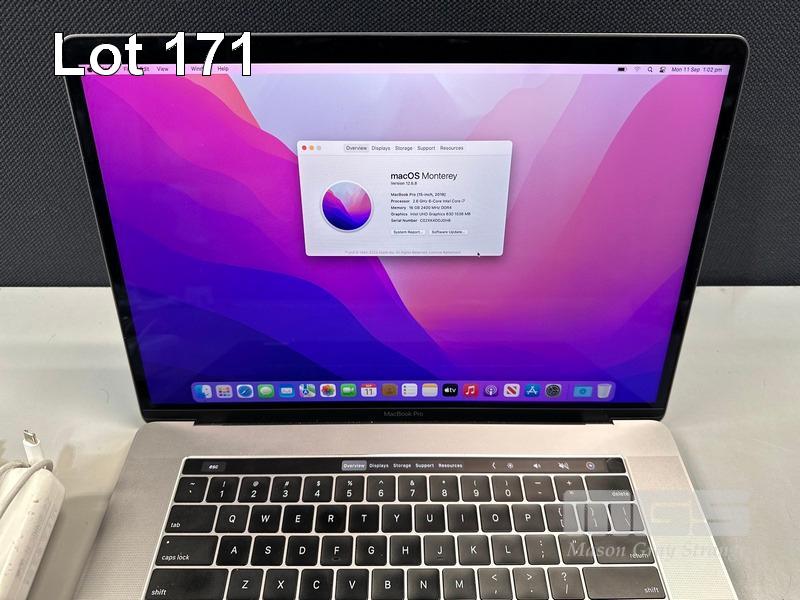 LAPTOP, APPLE MACBOOK PRO (A1990), CORE i7 8850H (8TH GEN) @ 2.6GHz, 16GB DDR4 RAM, 1TB SSD, 15.4" RETINA DISPLAY (2880x1800), INTEL UHD GRAPHICS 630, THUNDERBOLT 3, TOUCHBAR, Wi-Fi, BLUETOOTH, MAC OS 12 INSTALLED & USB-C POWER SUPPLY (NOTE: MINOR MARKS ON SCREEN, BATTERY SERVICE RECOMMENDED) S/N:C02XK4DDJGH6
