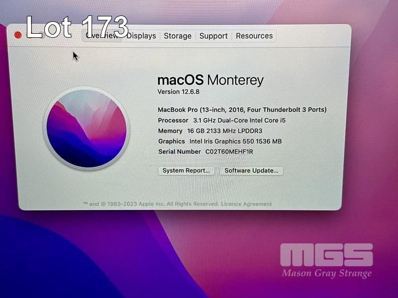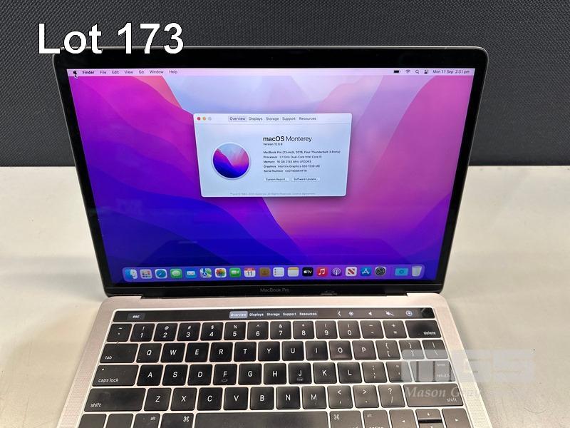 LAPTOP, APPLE MACBOOK PRO (A1706), CORE i5 6287U (6TH GEN) @ 3.1GHz, 16GB DDR3 RAM, 1TB SSD, 13.3" RETINA DISPLAY (2560x1600), INTEL IRIS GRAPHICS 550, THUNDERBOLT 3, TOUCHBAR, Wi-Fi, BLUETOOTH, MAC OS 12 INSTALLED (NO USB-C POWER SUPPLY) (NOTE: DAMAGE TO CASING, MARKS ON SCREEN, BATTERY SERVICE RECOMMENDED) S/N:C02T60MEHF1R