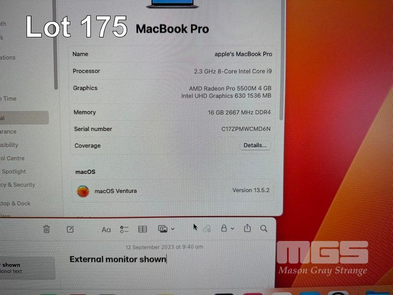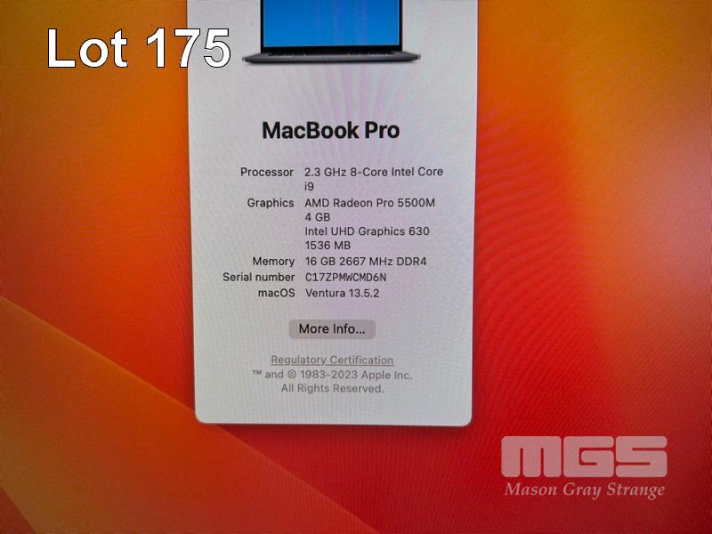 LAPTOP, APPLE MACBOOK PRO (A2141), CORE i9 9880H (9TH GEN) @ 2.3GHz, 16GB DDR4 RAM, 1TB SSD, 16" RETINA DISPLAY (3072x1920), 4GB AMD RADEON PRO 5500M VIDEO, INTEL UHD GRAPHICS 630, THUNDERBOLT 3, TOUCHBAR, Wi-Fi, BLUETOOTH, MAC OS 13.5 INSTALLED (NO USB-C POWER SUPPLY) (NOTE: DAMAGED SCREEN - NO DISPLAY, DAMAGE TO CASING) S/N:C17ZPMWCMD6N