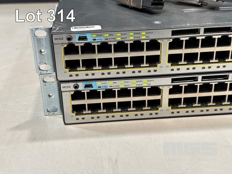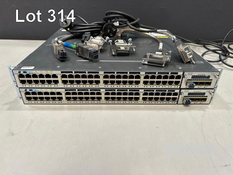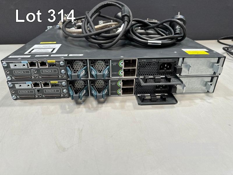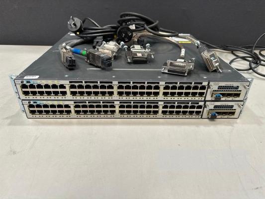 2 x CISCO CATALYST 3750-X SERIES 48-PORT SWITCHES, WS-C3750X-48P-S V04 EACH WITH C3KX-NM-1G NETWORK MODULE, STACK CABLES & IEC-C15 NOTCH POWER CABLES S/N:FDO1649Z2G6, FDO1649Z2CP