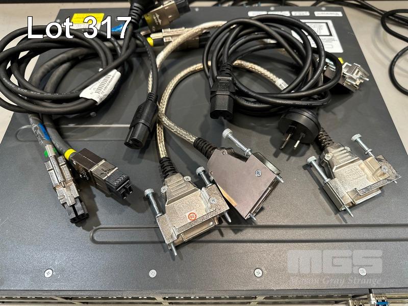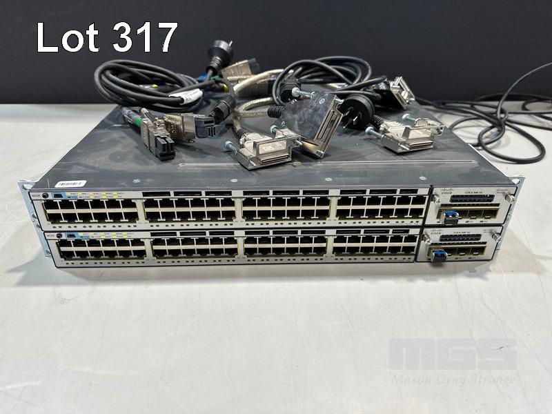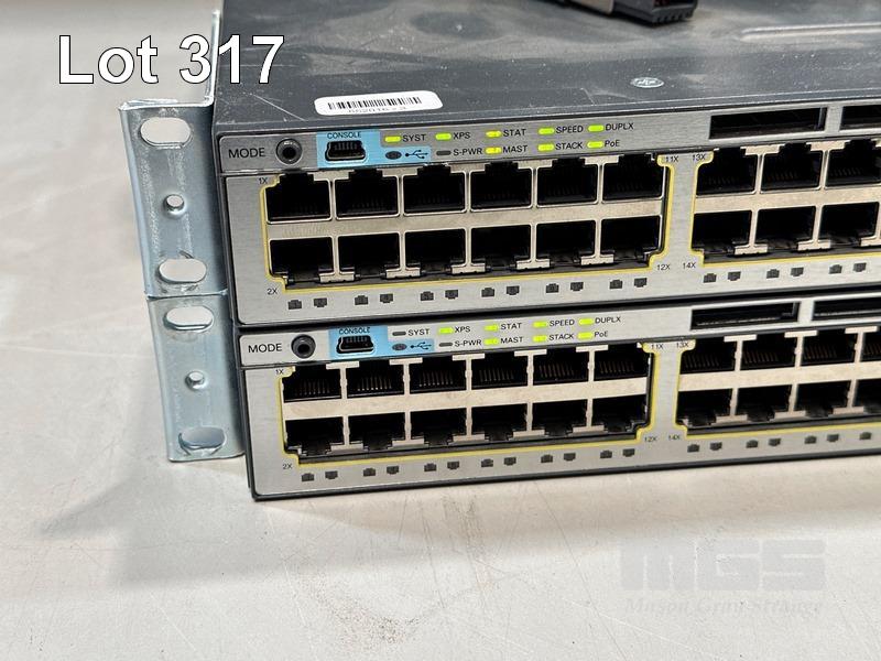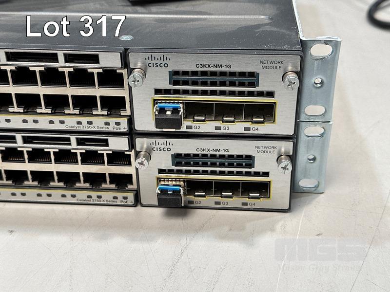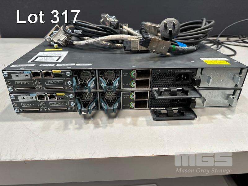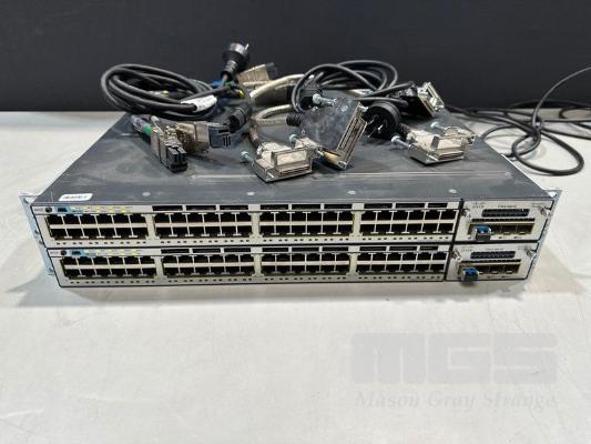 2 x CISCO CATALYST 3750-X SERIES 48-PORT SWITCHES, WS-C3750X-48P-S V04 EACH WITH C3KX-NM-1G NETWORK MODULE, STACK CABLES & IEC-C15 NOTCH POWER CABLES S/N:FDO1649Z2FC, FDO1649Z2GH