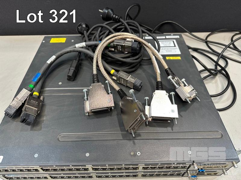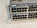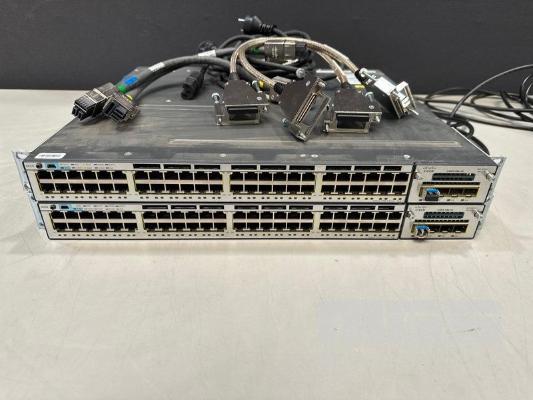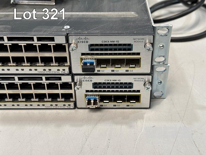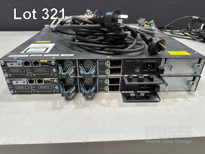 2 x CISCO CATALYST 3750-X SERIES 48-PORT SWITCHES, WS-C3750X-48P-S V03 EACH WITH C3KX-NM-1G NETWORK MODULE, STACK CABLES & IEC-C15 NOTCH POWER CABLES S/N:FDO1631P07D, FDO1635R0Y3