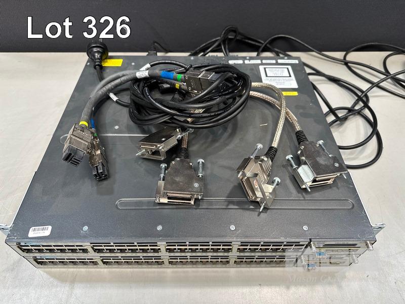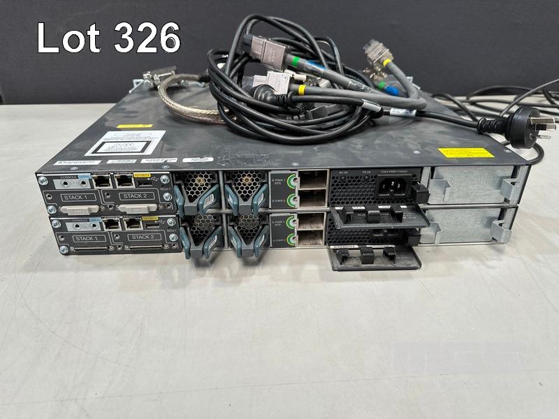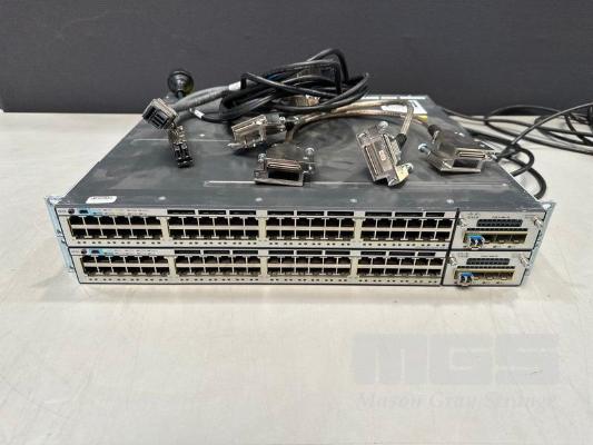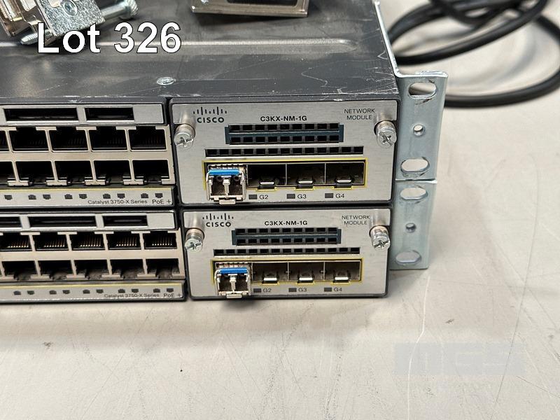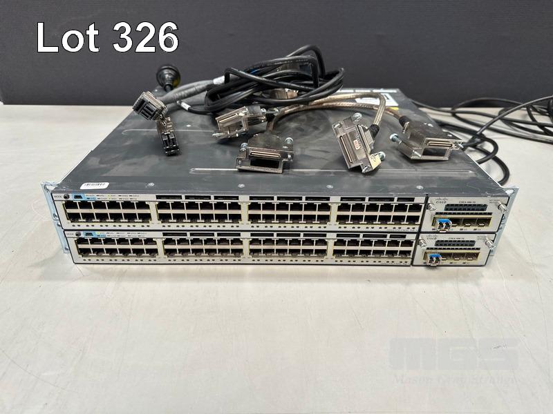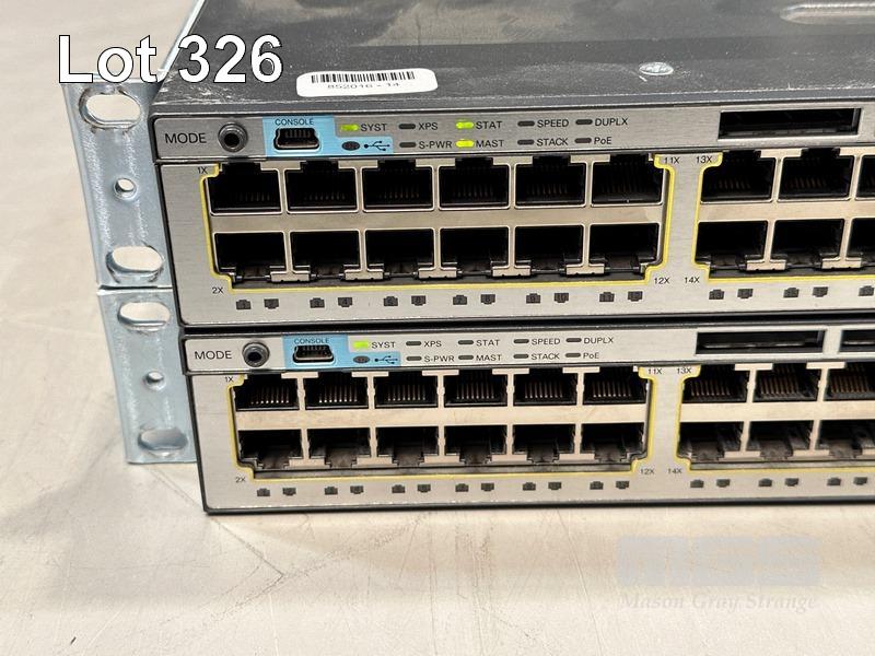 2 x CISCO CATALYST 3750-X SERIES 48-PORT SWITCHES, WS-C3750X-48P-S V03 EACH WITH C3KX-NM-1G NETWORK MODULE, STACK CABLES & IEC-C15 NOTCH POWER CABLES S/N:FDO1630R1QV, FDO1630R3PN