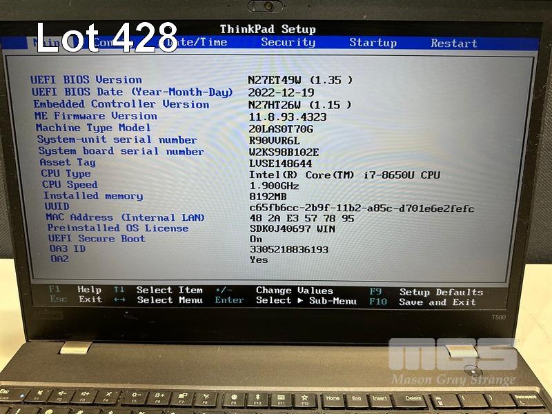 LAPTOP, LENOVO THINKPAD T580, TYPE 20LA, CORE i7 8650U (8TH GEN) @ 1.9GHz, 8GB DDR4 RAM, 512GB NVMe M.2 SSD, 15.6" WIDESCREEN (1920x1080), INTEL UHD GRAPHICS, Wi-Fi, BLUETOOTH, WINDOWS 11 PRO INSTALLED (NO USB-C POWER SUPPLY) (NOTE: MINOR MARKS ON SCREEN) S/N:R90VVR6L