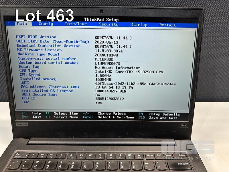 LAPTOP, LENOVO THINKPAD E480, TYPE 20KN, CORE i5 8250U (8TH GEN) @ 1.6GHz, 16GB DDR4 RAM, 256GB NVMe M.2 SSD, 14" WIDESCREEN (1920x1080), INTEL HD VIDEO, Wi-Fi, BLUETOOTH, WINDOWS 11 PRO INSTALLED & USB-C POWER SUPPLY (NOTE: MARKS ON SCREEN) S/N:PF1EK3WD