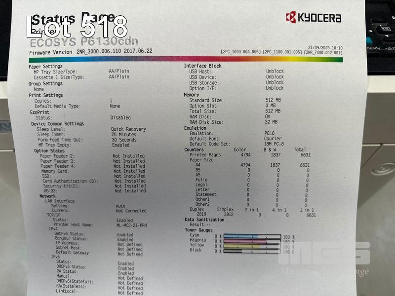 PRINTER, KYOCERA P6130cdn COLOUR LASER, USB, NETWORK, 4,794 COLOUR & 1,837 B&W PAGES (TEST PAGE ATTACHED) S/N:V5S7X01615
