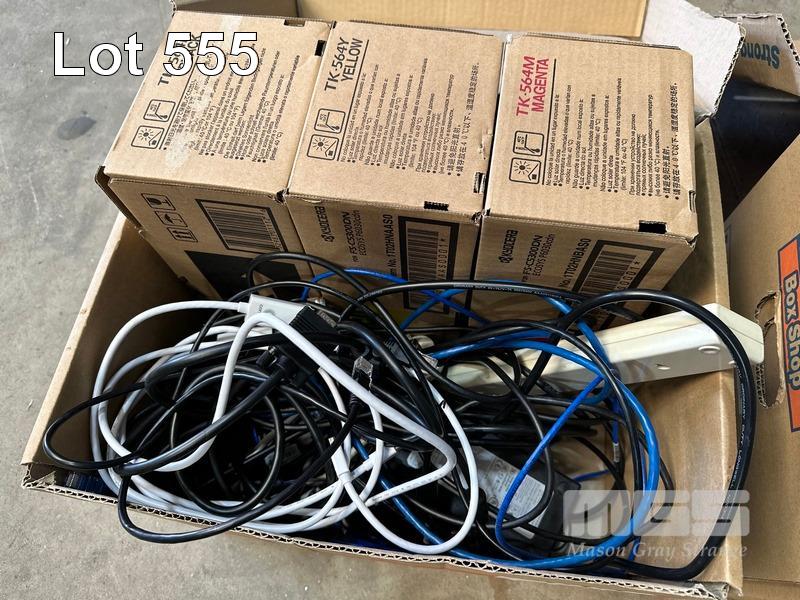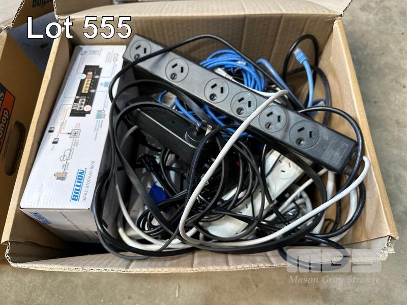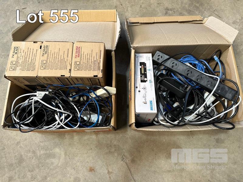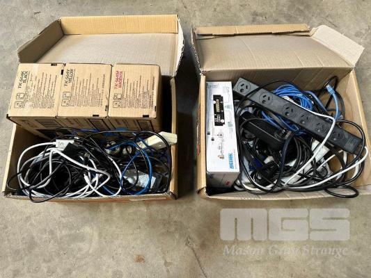 2 x BOXES ASST POWER BOARDS, CABLES, KYOCERA TONER ETC