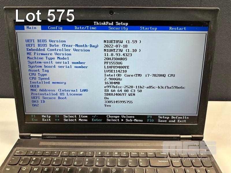 LAPTOP, LENOVO THINKPAD P51 MOBILE WORKSTATION, TYPE 20HJ, CORE i7 7820HQ (7TH GEN) @ 2.9GHz, 16GB DDR4 RAM, 512GB NVMe M.2 SSD, 15.6" WIDESCREEN (1920x1080), 4GB NVIDIA QUADRO M2200 VIDEO, Wi-Fi, BLUETOOTH, WINDOWS 10 PRO INSTALLED (NO POWER SUPPLY) (NOTE: MARKS & SPOTS ON SCREEN, SMALL CRACK LINE ON CASING) S/N:PF155SUG