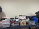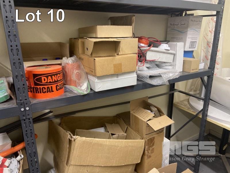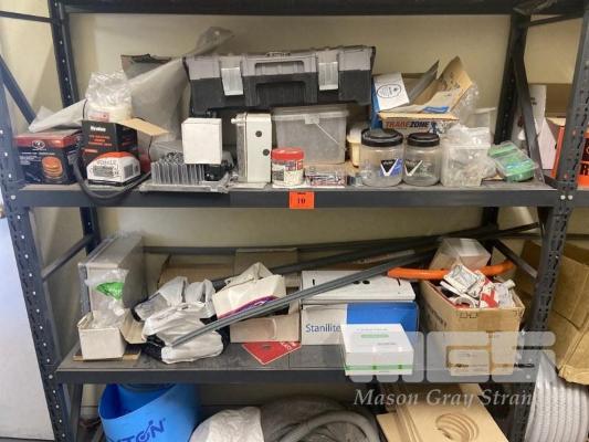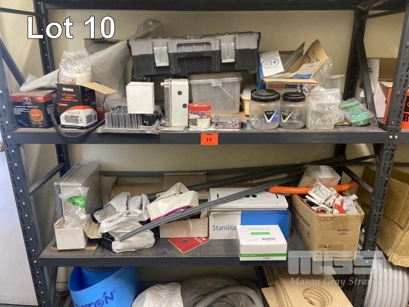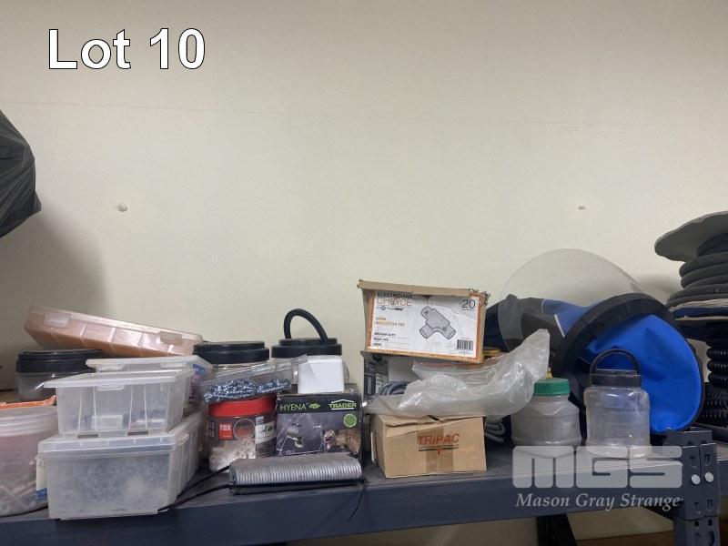 CONTENTS OF 2 x BAYS, ASSORTED HARDWARE, 12v HAZARD LIGHTS, GRAB KIT TOOL BOX, FLEXIBLE CONDUIT ETC.