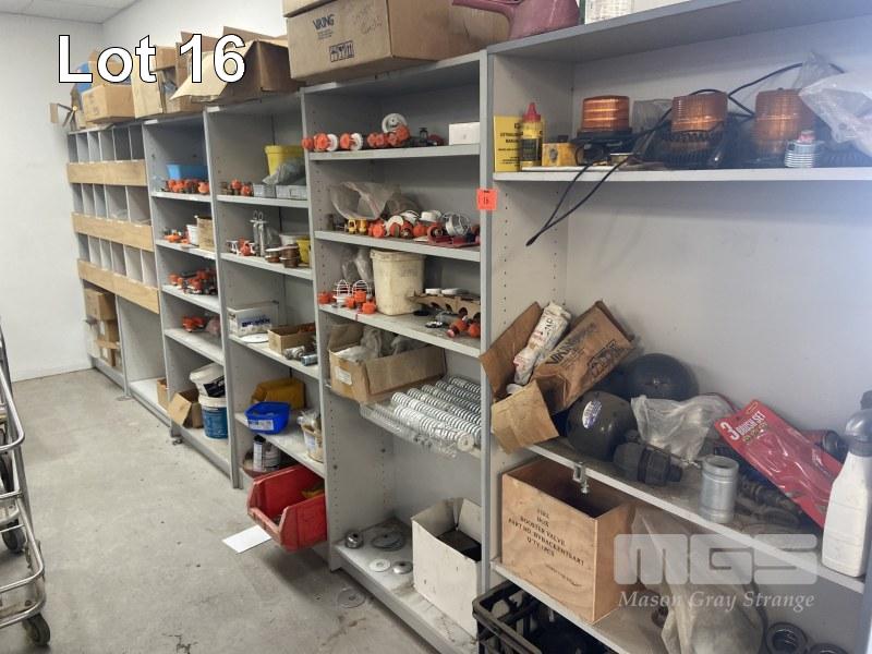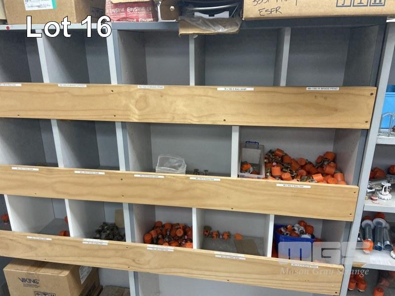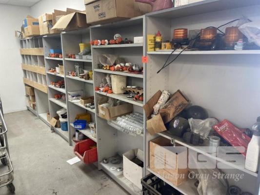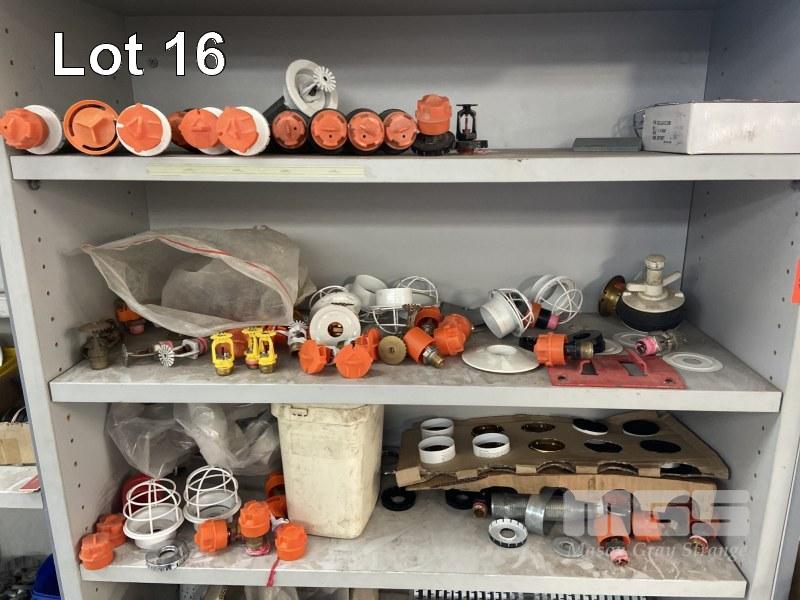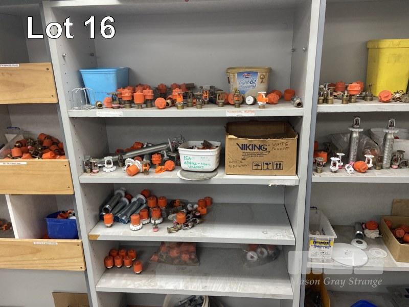 CONTENTS OF 5 x BAYS SHELVING, LARGE QUANTITY SCRAP FIRE SPRINKLERS,12v HAZARD LIGHTS, ASSORTED FIRE SAFETY HARDWARE, SHELF UNITS INCLUDED (FIRE SPRINKLERS FOR SCRAP ONLY NOT TO BE REINSTALLED)