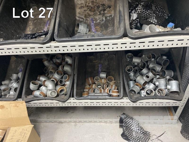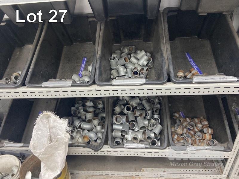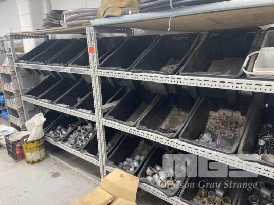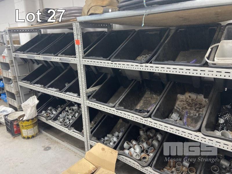 2 x MODULAR STORAGE RACKS 1800 x 1800mm, PLUS 24 x PARTS BINS, INCLUDING GALV PIPE FITTINGS, ELBOWS, JOINERS, T SECTIONS, REDUCERS, PLUS ASSORTED HOSES