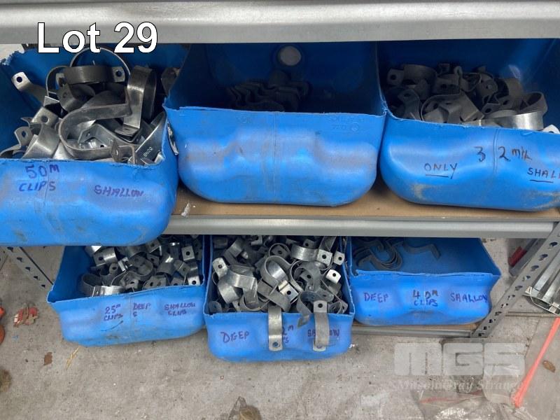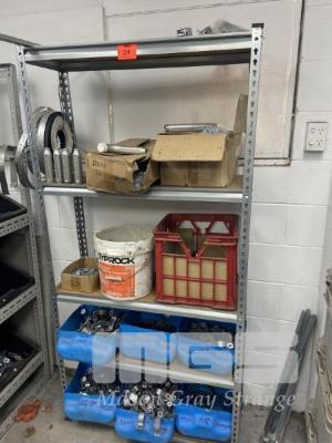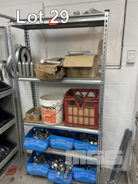 LARGE QUANTITY GALV CLAMPS, ASSORTED GALV REDUCING NIPPLES, PIPE BRACKETS ETC. SHELF UNIT INCLUDED