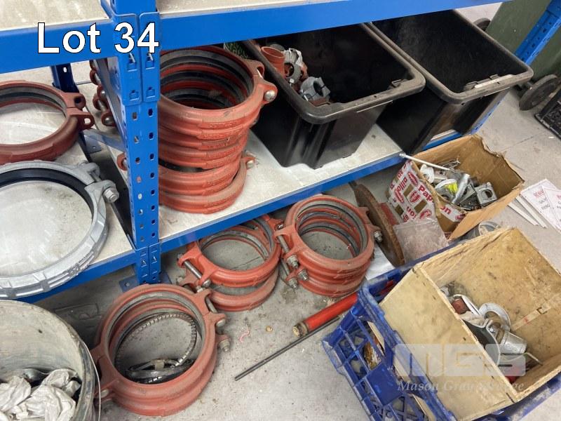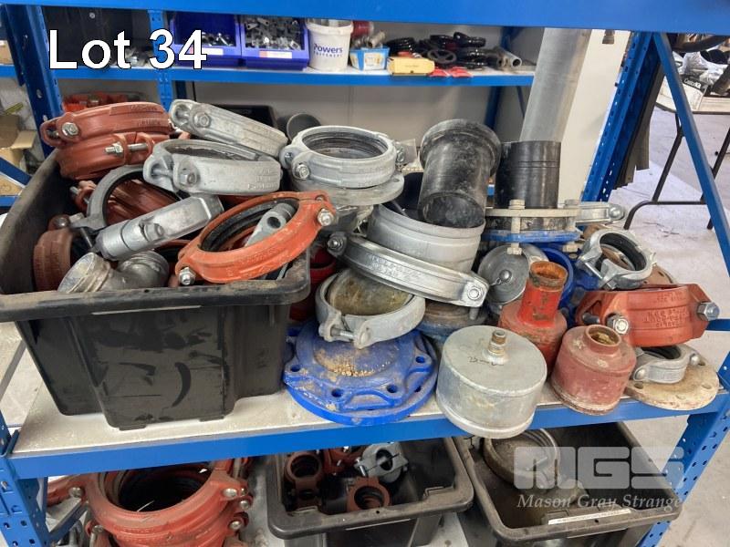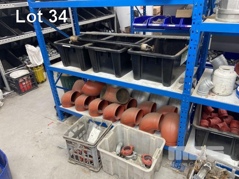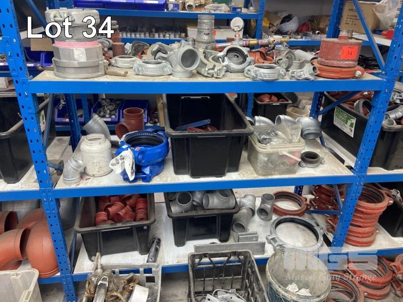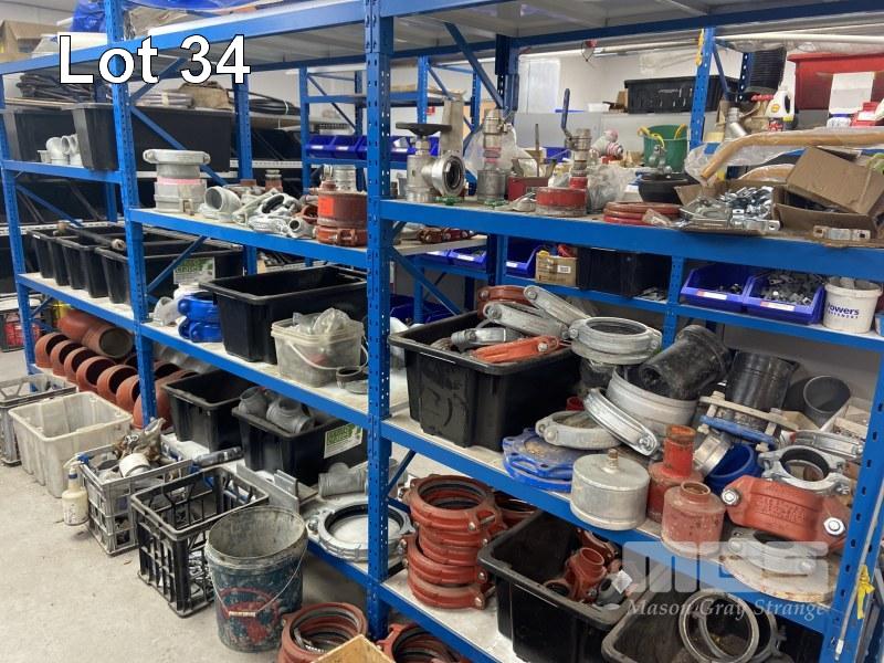 3 x BAYS FIRE SPRINKLER FITTINGS, LARGE ELBOWS & T's, 55mm, 95mm, 150mm, 200mm ETC, PIPE COUPLINGS, ASSORTED VALVES, PVC CONDUIT ETC.
