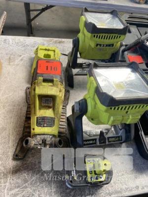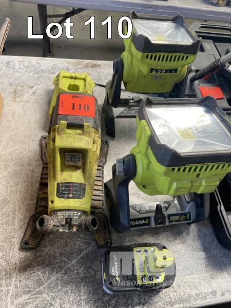 2 x RYOBI WORK LIGHTS, 1 x 5.0 Ah BATTERY WITH CHARGER, & RYOBI TRANSFER PUMP