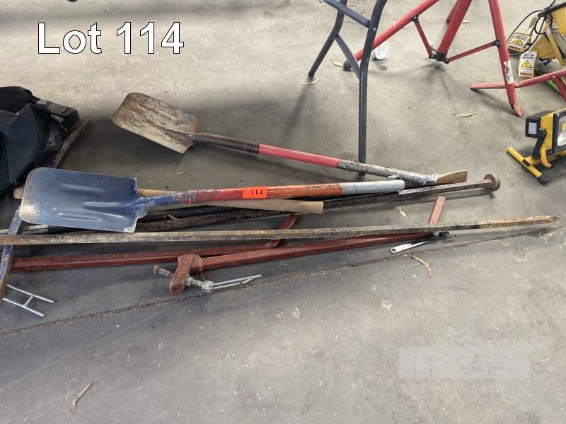 LANDSCAPING TOOLS, 2 x SHOVELS, PICK, 3 x CROW BARS, 2 x MAN HOLE LIFTERS