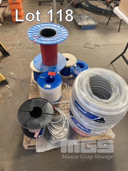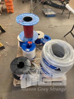PALLET LOT OF CABLE, 3 x ROLLS CORRUGATED CONDUIT, 25mm x 20m (L), 1 x ROLL 3 CORE POWER CABLE, 1 x ROLL FIGURE 8 CABLE 500m (L), 2 x ROLL PVC COATED GALV ROPE