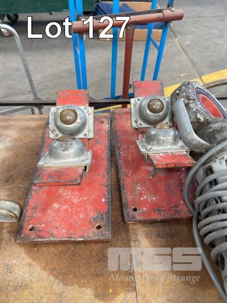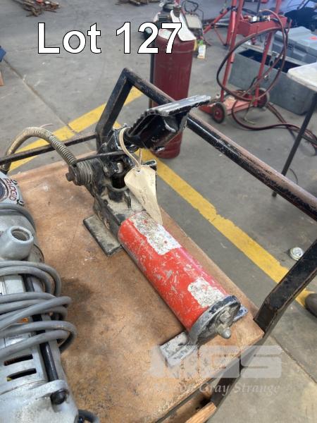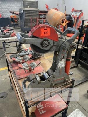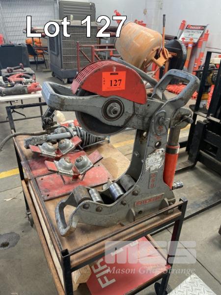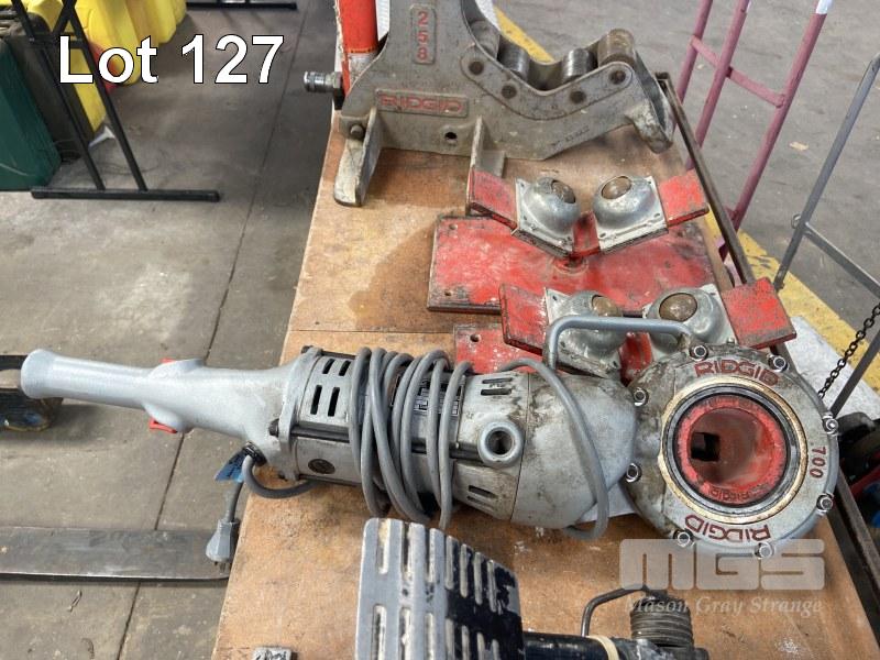 RIDGID PIPE THREADER SET, MODEL: 258, 2 1/3 TO 8 INCH PIPE, WITH RIDGID POWER DRIVE MODEL: 700, 240v, IN & OUT FEED ROLLERS & FOOT OPERATED HYRAULIC PUMP ON TROLLEY