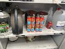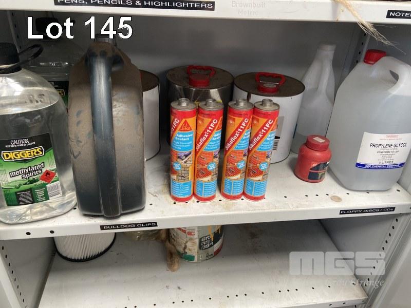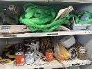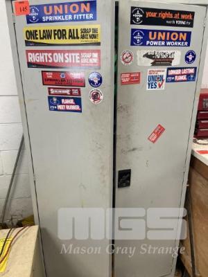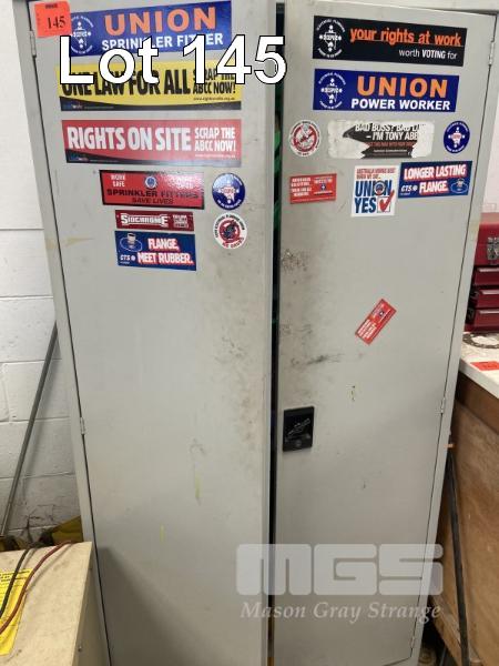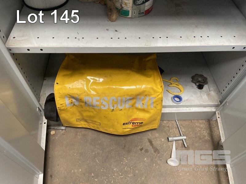 BROWN BUILT 2 DOOR STEEL CUPBOARD & CONTENTS, SLINGS, STRAPS, SIKAFLEX TUBES, METHALAYTED SPIRITS, LOW VOLT RESCUE KIT, SAND PAPER ETC.