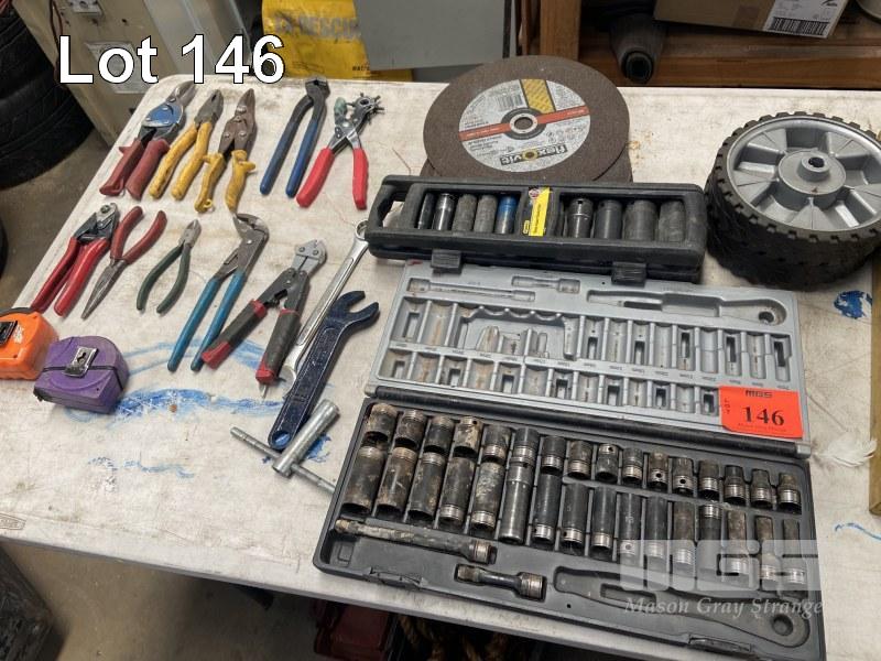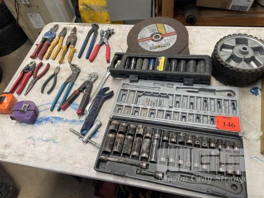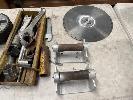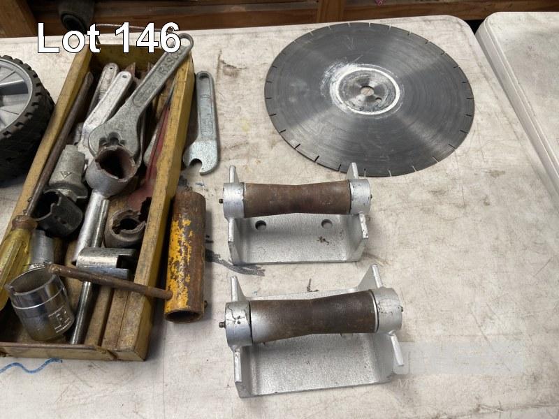 CONTENTS OF TABLE, VARIOUS HAND TOOLS, 2x IMPACT SOCKET SETS, METAL BLADES, CONCRETE BLADE, 2 x IN FEED ROLLERS, 2 x TROLLEY WHEELS