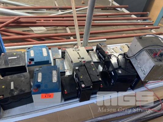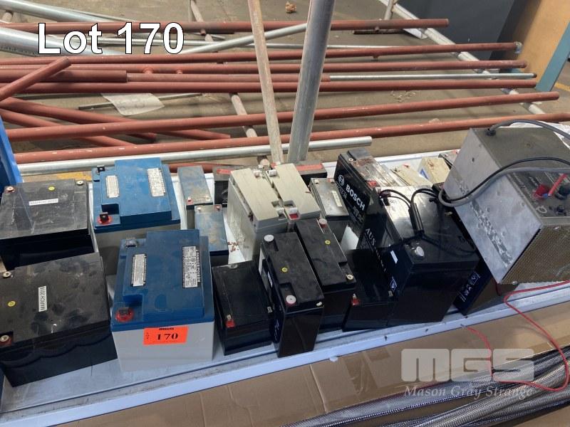 22 x ASSORTED SIZE BATTERIES, 12v 7 amp, 12v 12 amp, 12v 18amp, 12v 26amp, 12v 40amp, 12v 55amp ETC, WITH O'DONNEL GRIFFIN BATTERY CHARGER (CONDITION UNKNOWN)
