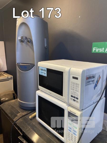 WESTINGHOUSE 2 DOOR FRIDGE, WHITE, 340L, 2 x MICROWAVES & WATER COOLER UNIT, DESK, GAS LIFT OFFICE CHAIR, 2 DOOR CUPBOARD, 3 DRAWER FILING CABINET