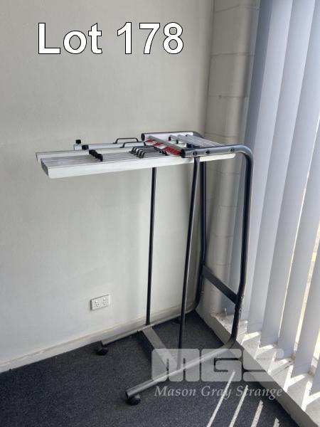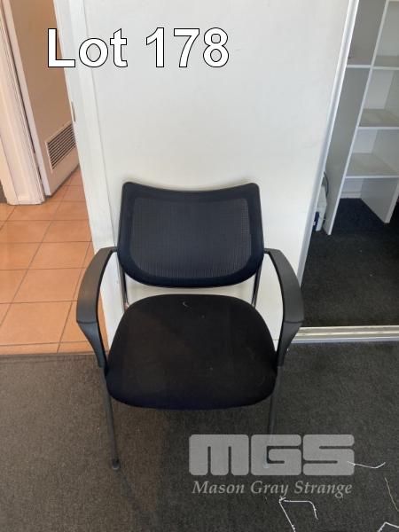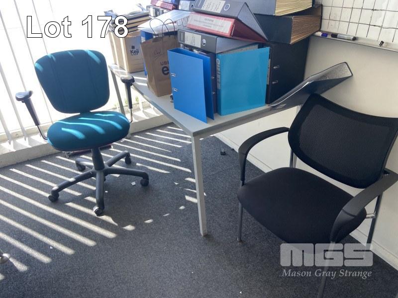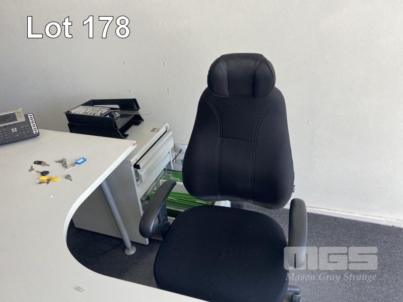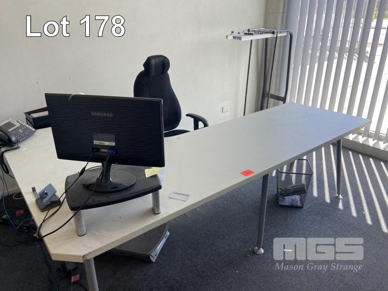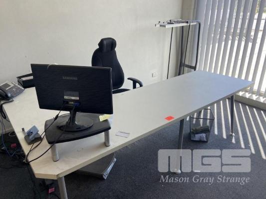 CONTENTS OF OFFICE L SHAPE DESK, WHITE TIMBER LAMINATE, 2400 x 1500mm, 2 x GAS LIFT OFFICE CHAIRS, 3 DRAWER MOBILE, 2 x BLACK CLOTH VISITORS CHAIRS, SAMSUNG 20 INCH MONITOR, BROTHER MFC, MODEL: MFC-9120CN, PLAN HANGER, WHITE LAMINATE TABLE 1500 x 750mm