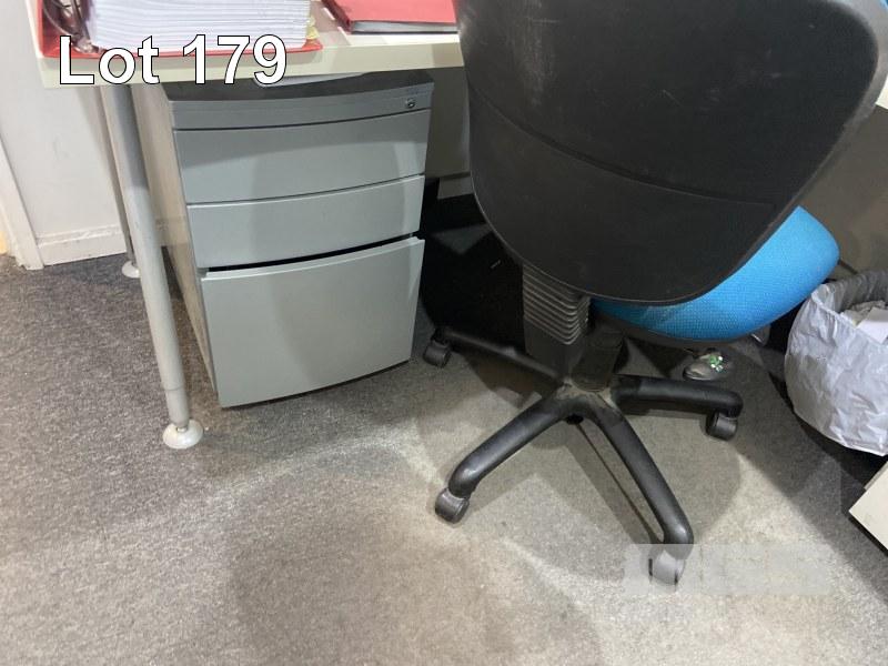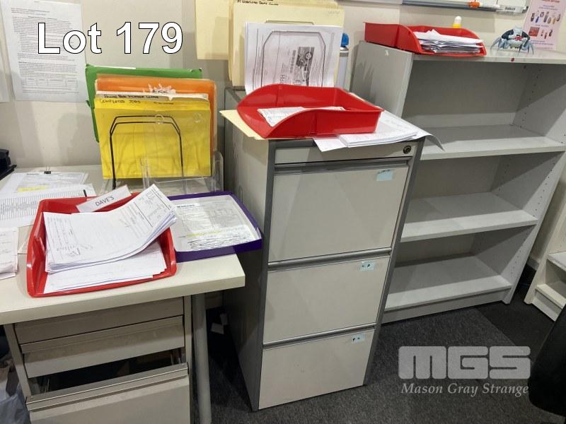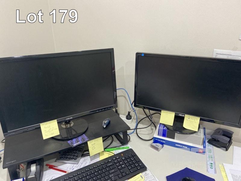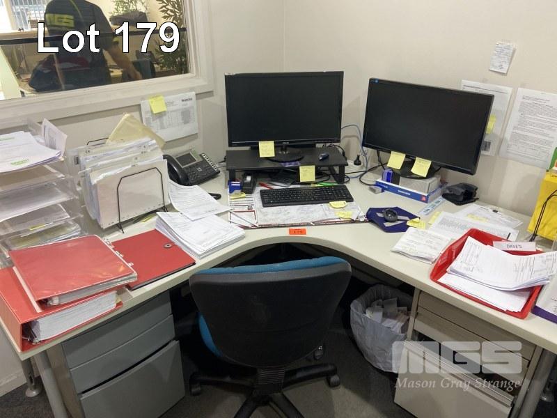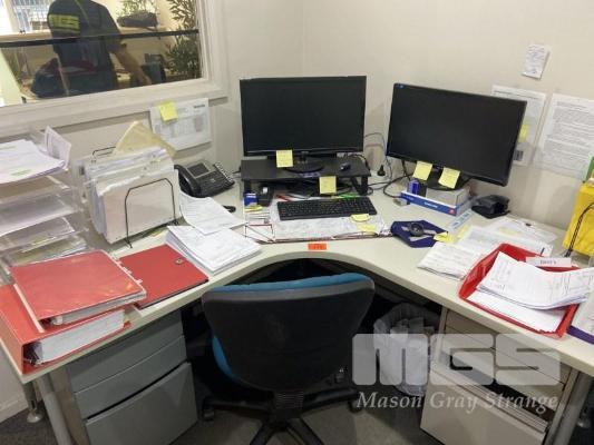 L SHAPE DESK, WHITE TIMBER LAMINATE, 1800 x 1800mm 2 x 3 DRAWER UNDER DESK MOBILES, GAS LIFT OFFICE CHAIR, 2 x ASUS 24 INCH MONITORS, 3 DRAWER FILING CABINET, 4 TIER BOOK SHELF