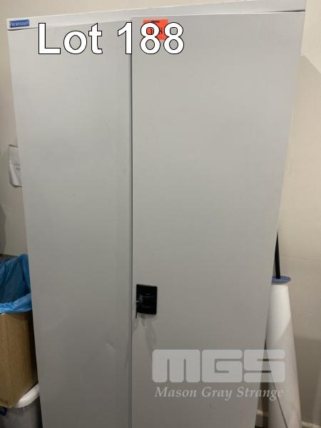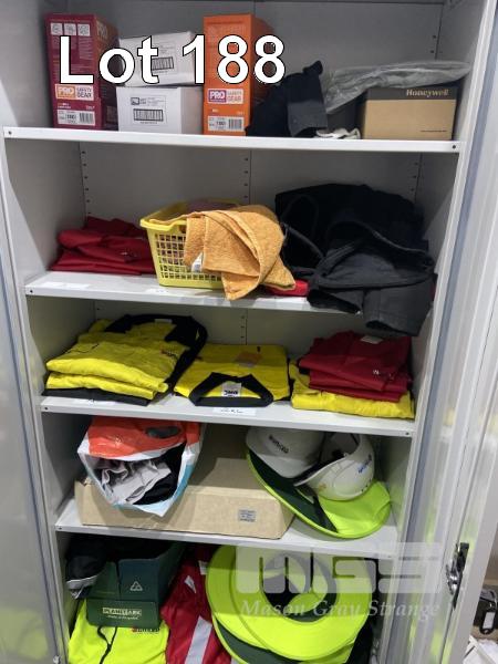 CONTENTS OF PARAMOUNT STEEL 2 DOOR CUPBOARD, HARD HATS, SUN VISORS, WORK SHIRTS, EAR PLUGS, SAFETY GLASSES