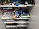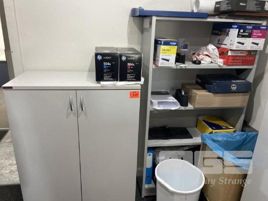 2 DOOR TIMBER LAMINATE STORAGE CUPBOARD & CONTENTS ASSORTED STATIONARY, 4 TIER TIMBER LAMINATE SHELF UNIT & CONTENTS, ASSORTED STATIONARY ETC.