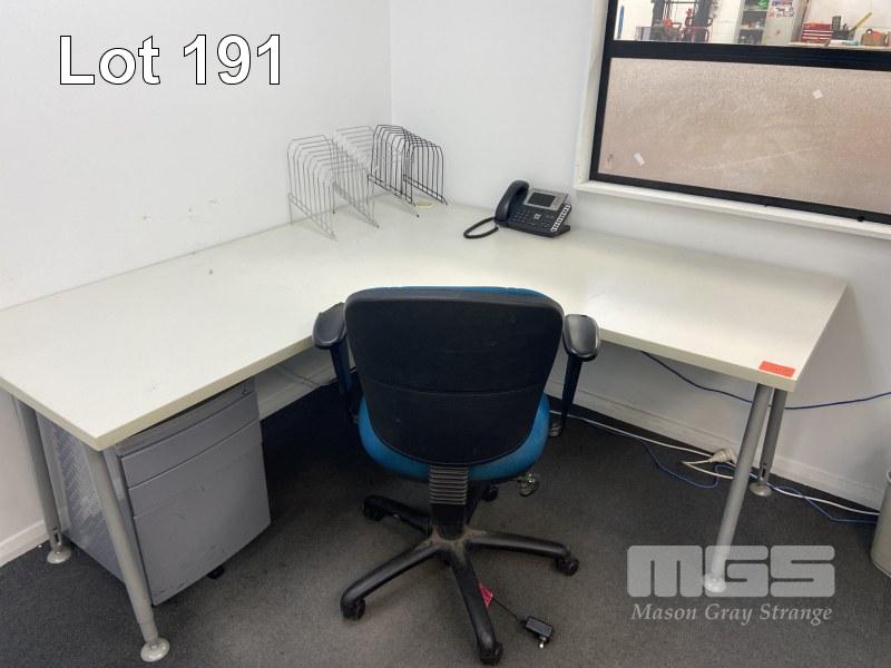 L SHAPED TIMBER LAMINATE DESK, 1800 x 1800mm, GAS LIFT OFFICE CHAIR, 3 DRAWER UNDER DESK MOBILE