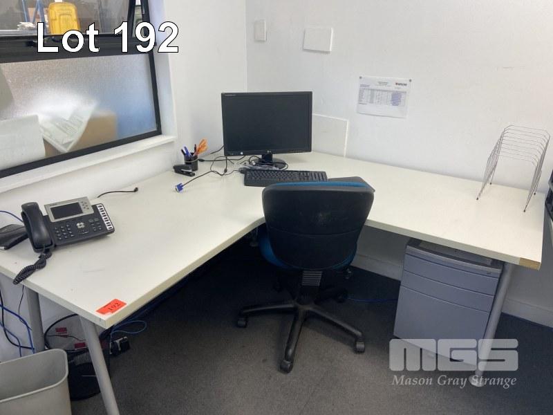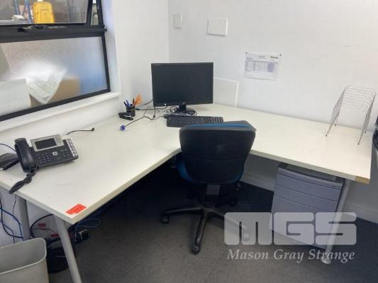 L SHAPED TIMBER LAMINATE DESK, 1800 x 1800mm, GAS LIFT OFFICE CHAIR, 3 DRAWER UNDER DESK MOBILE, 22 INCH LG MONITOR
