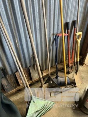 QUANTITY GARDEN TOOL, RAKES, SHOVELS, SPADE, ETC